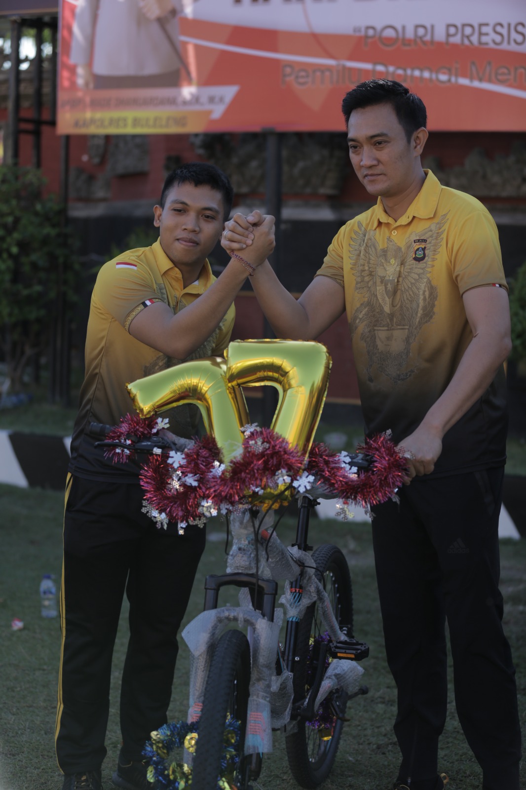 “saya merasa senang sekali mendapatkan hadiah lomba gerak jalan santai ini, dan sepeda ini digunakan untuk kegiatan olah raga agar kesehatan tetap terjaga melalui olah raga, terimaksih atas hadiah yang diberikan”, ucap Komang Ari Kusuma.